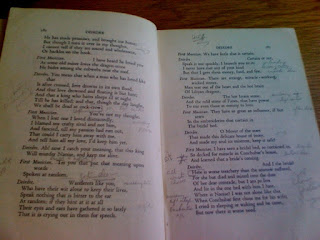 As discussed before on this blog, Mary O’Malley was an enthusiastic supporter of the dramas written by W.B. Yeats. Indeed the Lyric from its earliest days staged these challenging productions, and when the Lyric became a professional organisation its allegiance to Yeats was expressly conveyed in its constitution. These plays were primarily directed by Mary O’Malley herself, and this item from the archive at NUI Galway has recently come up for cataloguing. Originally just a hardcover compilation of all of Yeats’ plays, O’Malley made this her own personal working script for Yeats productions. The script is peppered with O’Malley’s notes on stage direction, instructions for the actors, and other such valuable material for researchers.
