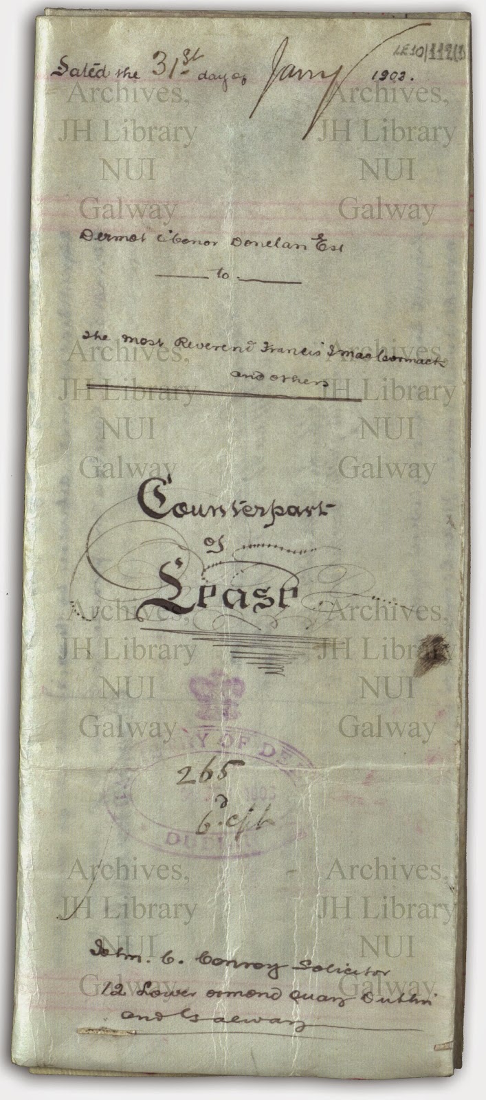 The Archives of the Hardiman Library hold a number of landed estate collections relating to major estates and families in the West of Ireland. The O’Connor Donelan collection provides a good example of the value of such records. The papers relate to the O'Connor Donelan family of Sylane, Tuam, County Galway. The papers cover the legal dealings of the family, the management of their various lands, and personal papers relating to various family members. The bulk of the personal material relates to Thomas O'Connor Donelan (1812-1874) and his sons. His eldest son Dermot had an interest in genealogy and forestry, and his other three sons were doctors in Dublin, Leeds and Manila.